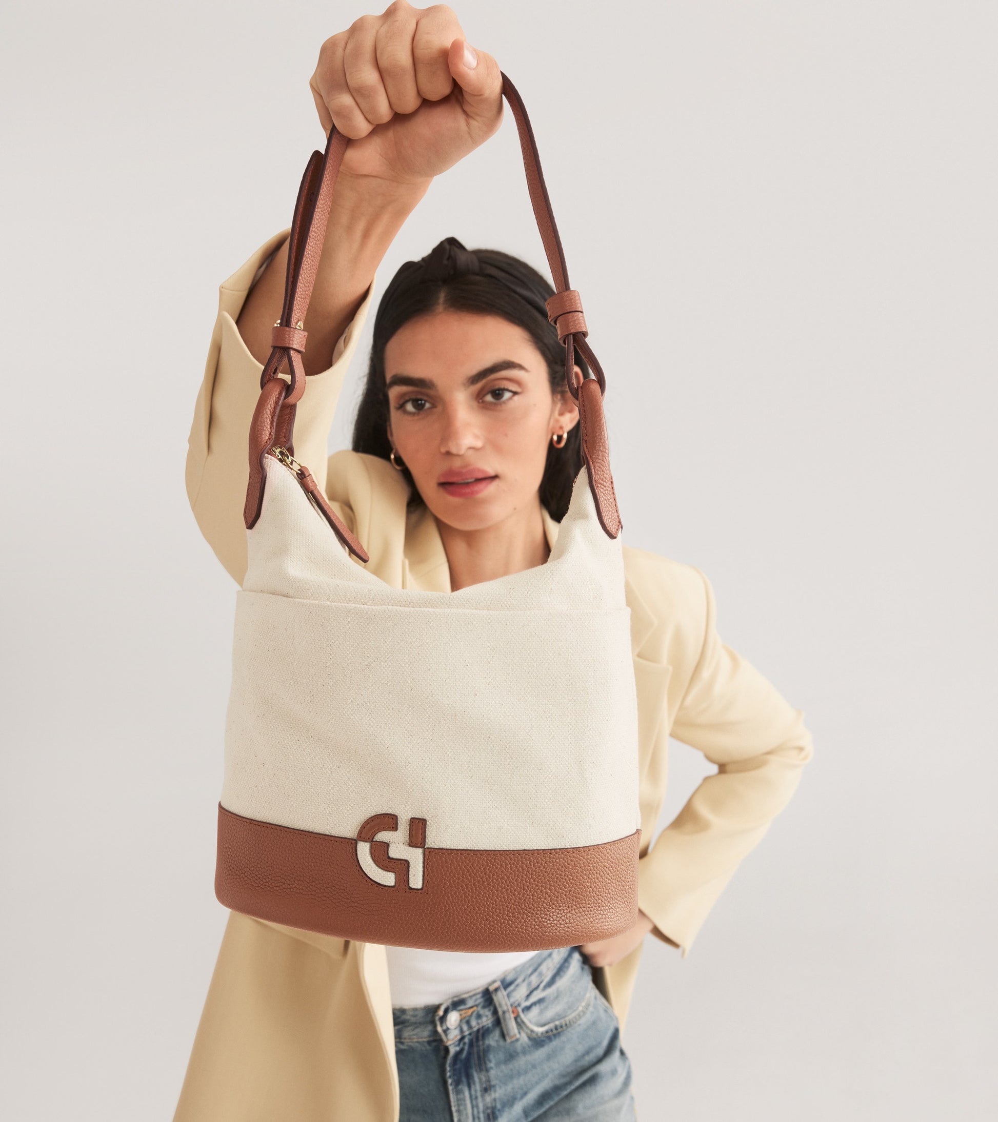 - حقيبة باكت ناعمة من القماش وتقليمات من الجلد الفاخر ...