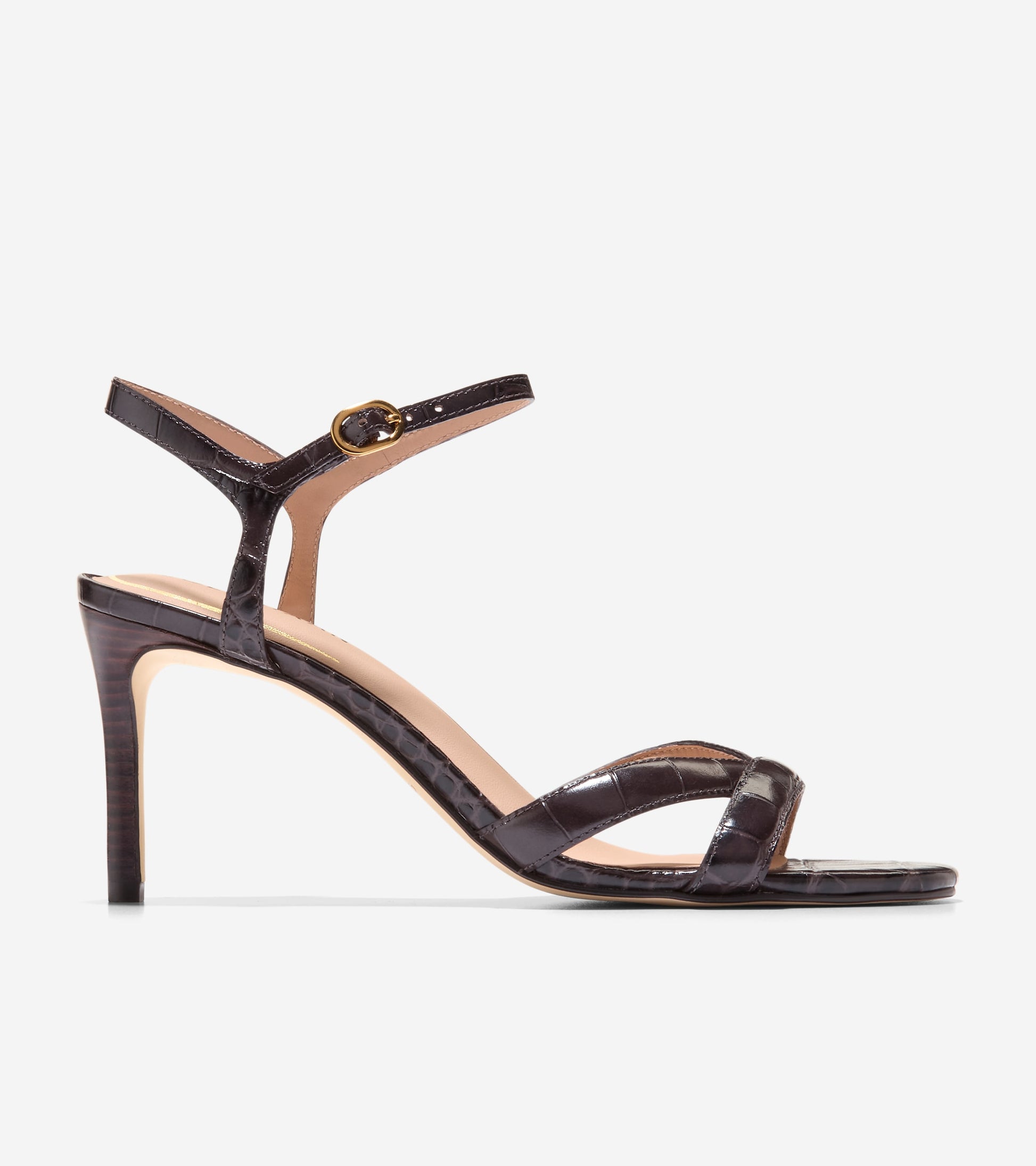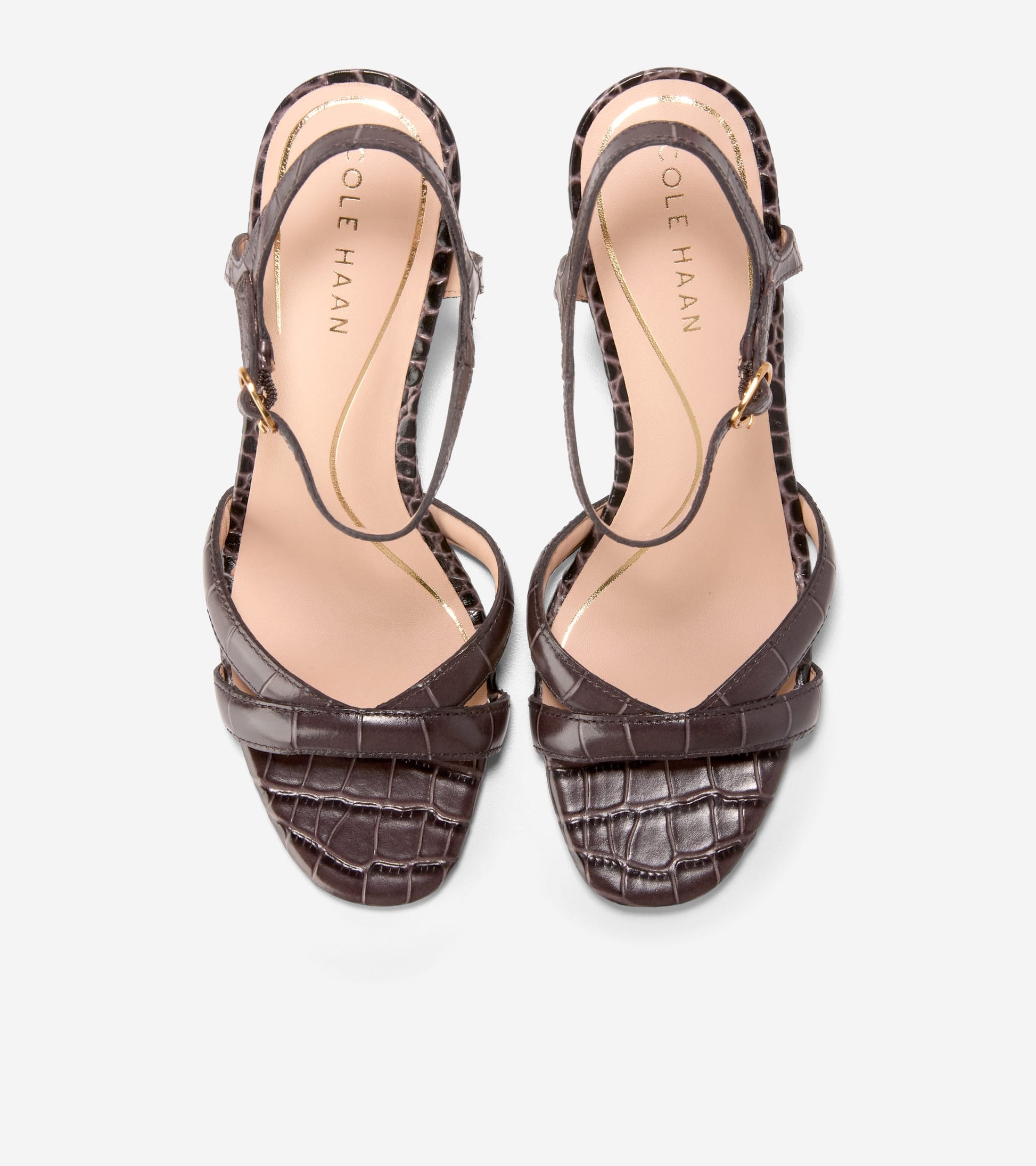 - Leather upper in Dark Chocolate Croc Print; ankle strap...